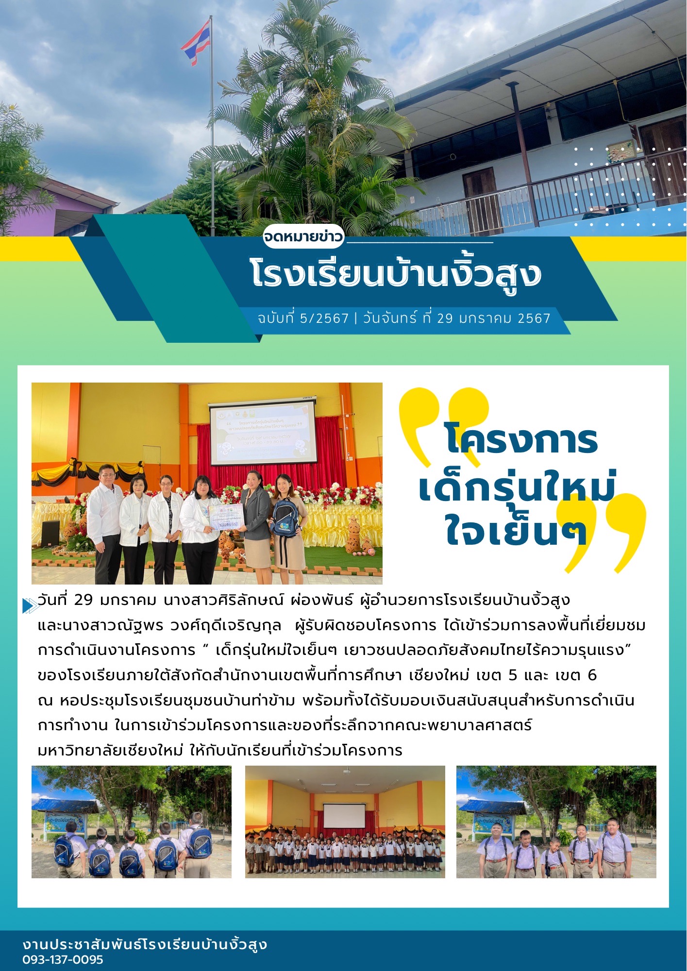วันที่ 29 มกราคม 2567 ได้เข้าร่วมการลงพื้นที่เยี่ยมชม การดำเนินงาน โครงการเด็กรุ่นใหม่ ใจเย็นๆ เยาวชนปลอดภัยสังคมไทยไร้ความรุนแรง ณ โรงเรียนชุมชนบ้านท่าข้าม อำเภอฮอด จังหวัดเชียงใหม่